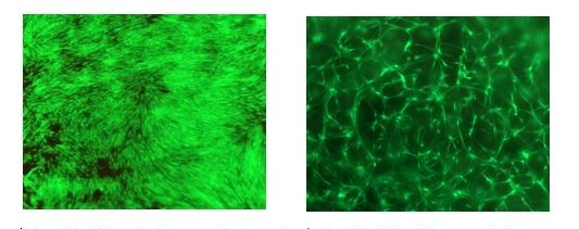 left: In-vitro 2D cell culture on hydrogel surface, good cell attachment and proliferation, human dermal fibroblasts